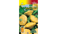 Новый, ультраскороспелый (от всходов до созревания 35-37дней), кустовой сорт патиссона корнишонного типа. Очень хорошо завязывается, растение формирует преимущественно женские цветки которые долго и дружно плодоносят. Плоды жёлто-оранжевого цвета, на грядке и на столе смотрятся очень нарядно, массой 15-30 г. (самый оптимальный размер для цельноплодного консервирования), не трескаются и не перерастают в течение 10-15 дней. Плоды очень однородные, качественные. Устойчив к заболеваниям. Мякоть плотная, нежная и хрустящая, очень сочная, с повышенным содержанием витаминов. Плоды используются для цельноплодного консервирования и маринования, как отдельно, так и совместно с огурцами и помидорами, а так же для домашней кулинарии (супов, тушения, жарки), заморозки. Это самый лучший сорт патиссонов для создания праздничного настроения на столе.
